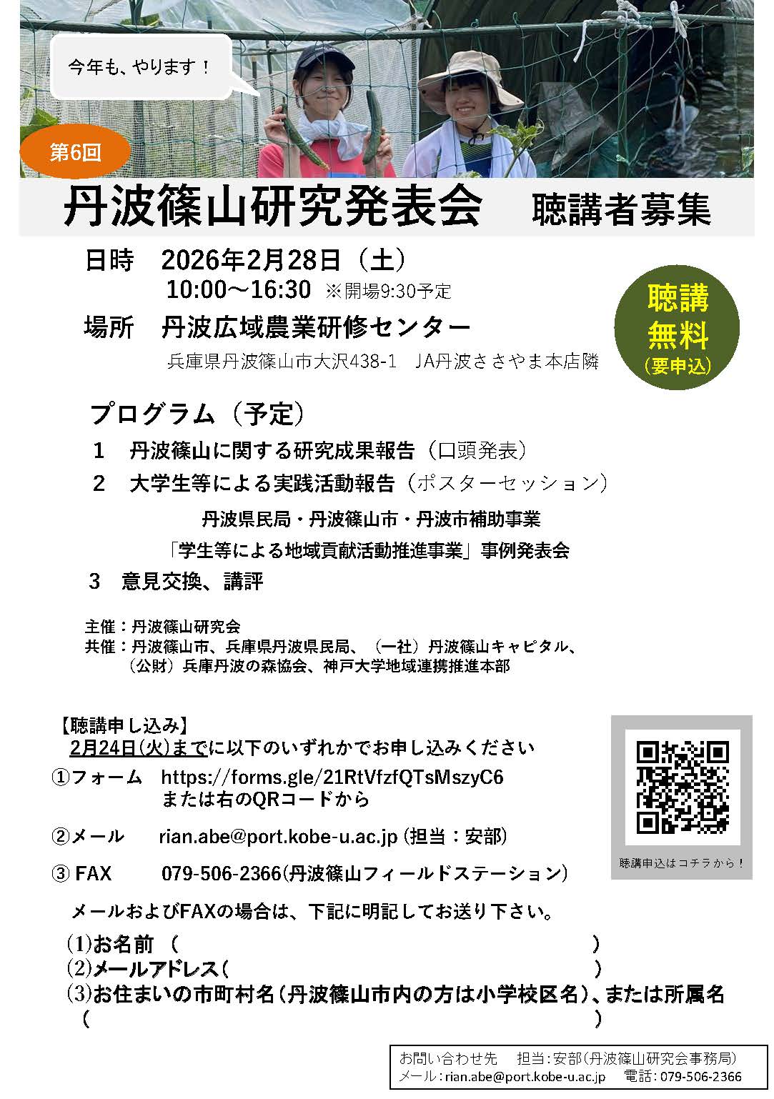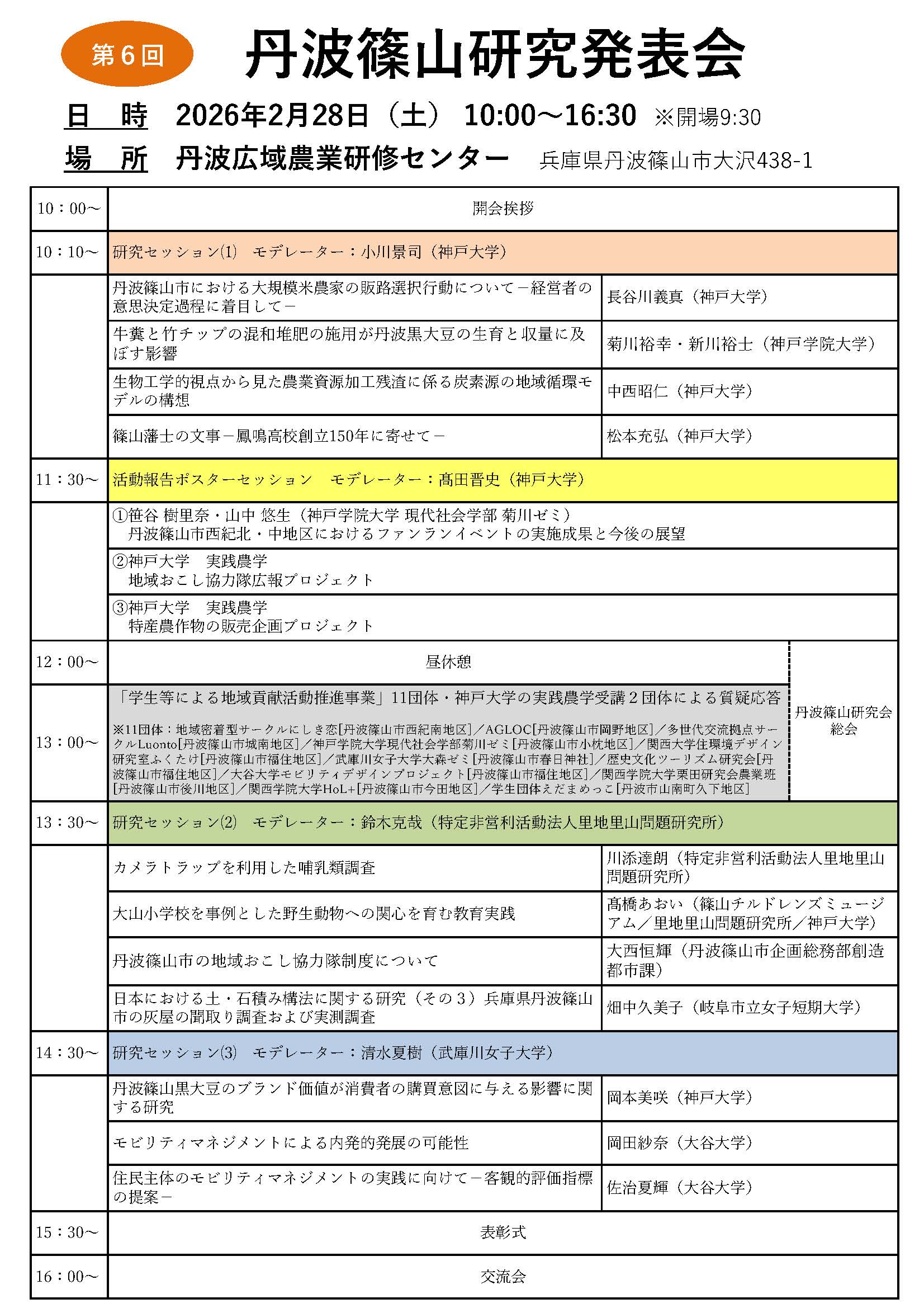 この発表会では、丹波篠山に関する研究成果の報告や、大学生等による丹波篠山での実践活動報告をポスターセッション形式で行います。このポスターセッションは、丹波県民局・丹波篠山市・丹波市補助事業である「学生等による地域貢献活動推進事業」事例発表会にも位置付けられています。